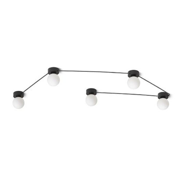 Tak- eller vägglampor med glasskärmar på svartlackade baser, anslutna i rad med svarta kablar. Armaturerna kan arrangeras i grupper efter din fantasi. Lämpliga för LED-ljuskällor med G9-sockel.