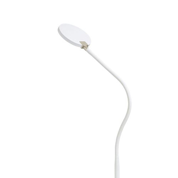 Dimbar golvlampa med svanhals och inbyggd LED-lampa, täckt av en mjölkig diffusor för mjuk belysning. Strömbrytaren är placerad på lampans kropp.