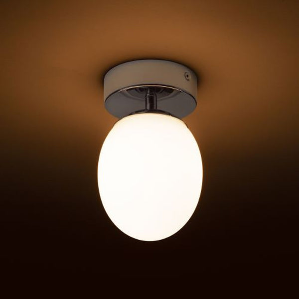 Taklampa med inbyggd LED-ljuskälla. Täckskivan i botten, som är av satinerat glas är fastspänd med en skruv täckt av en förkromad platta. Sidopanelerna är av frostad akrylplast.