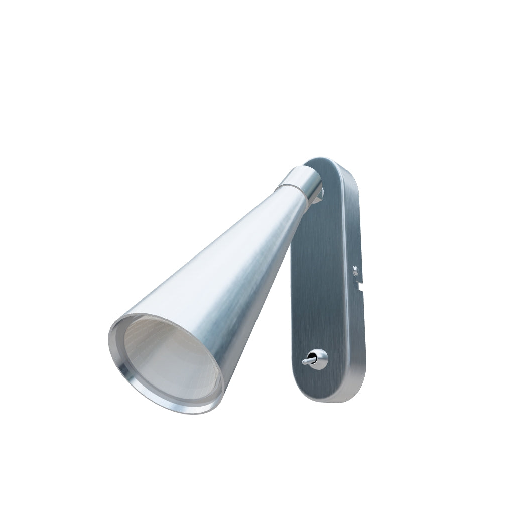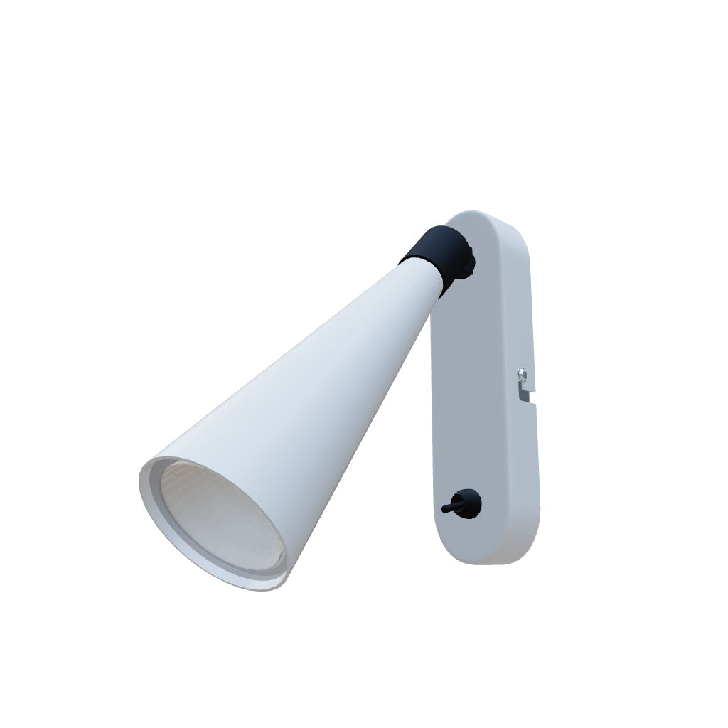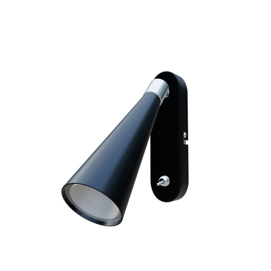 Väggmonterad belysning med konisk reflektor för en LED-lampa med GU10-fäste, och en av/på-knapp på basen.