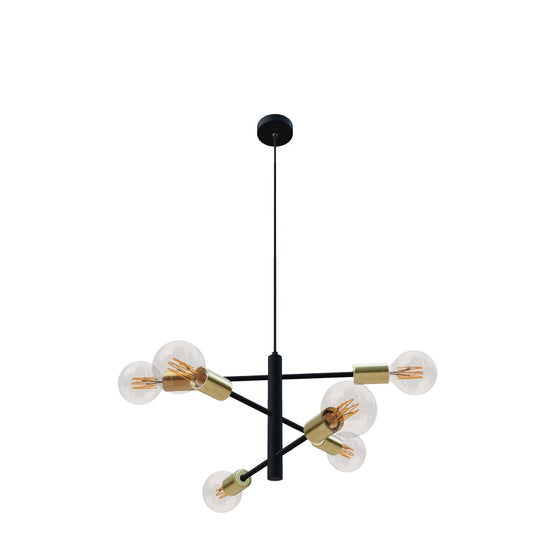 Designad pendel med dekorativa mässingscylindrar för socklar. Armaturen kan formas genom att justera armarna på den horisontella axeln. Lämplig för LED-ljuskällor med E27-sockel.