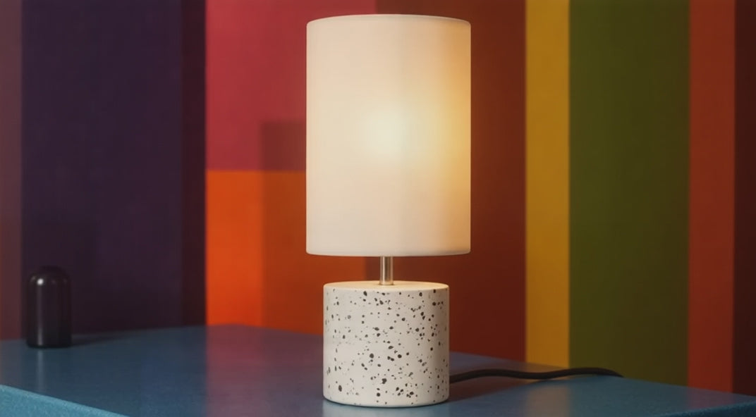 Minimalistisk cylinderformad bordlampa inklusive textilskärm. Varje bas har en unik finish.