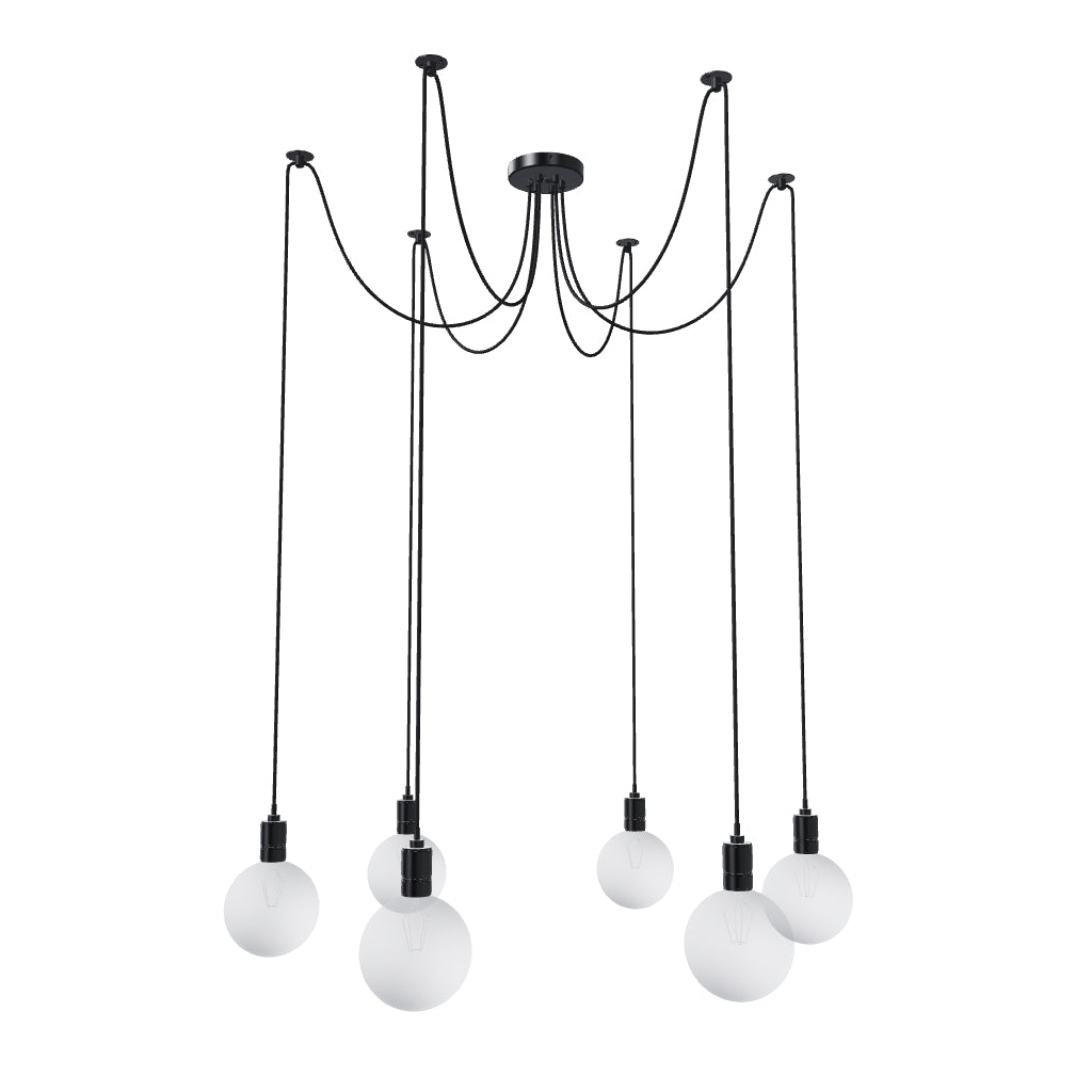 Pendel som har en central takbas och 6 st kablar med E27 sockel. Varje kabel fästs individuellt och fristående från takbasen. Längden på kablarna är 2m.