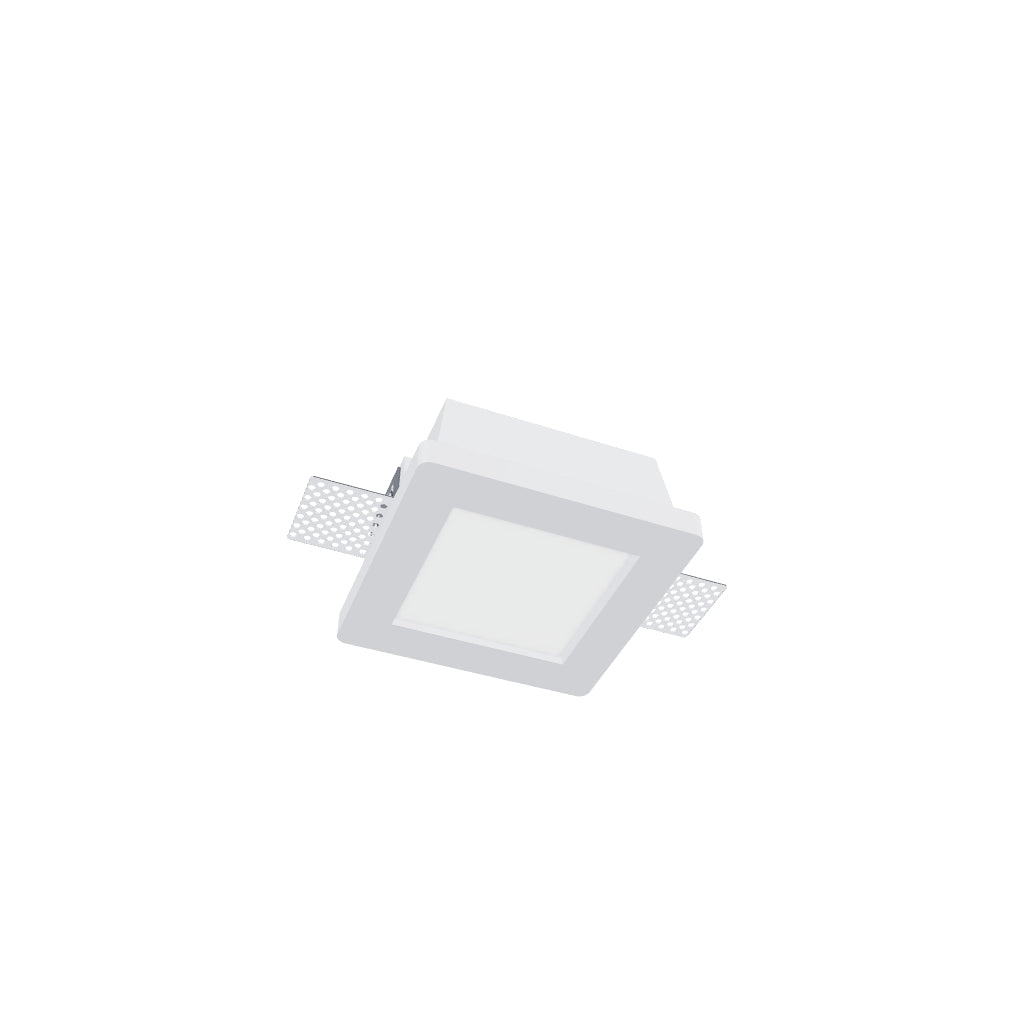 Infälld gipslampa i trimlessutförande med en täckskiva av satinerat glas. Endast för installation i gipsskiva.