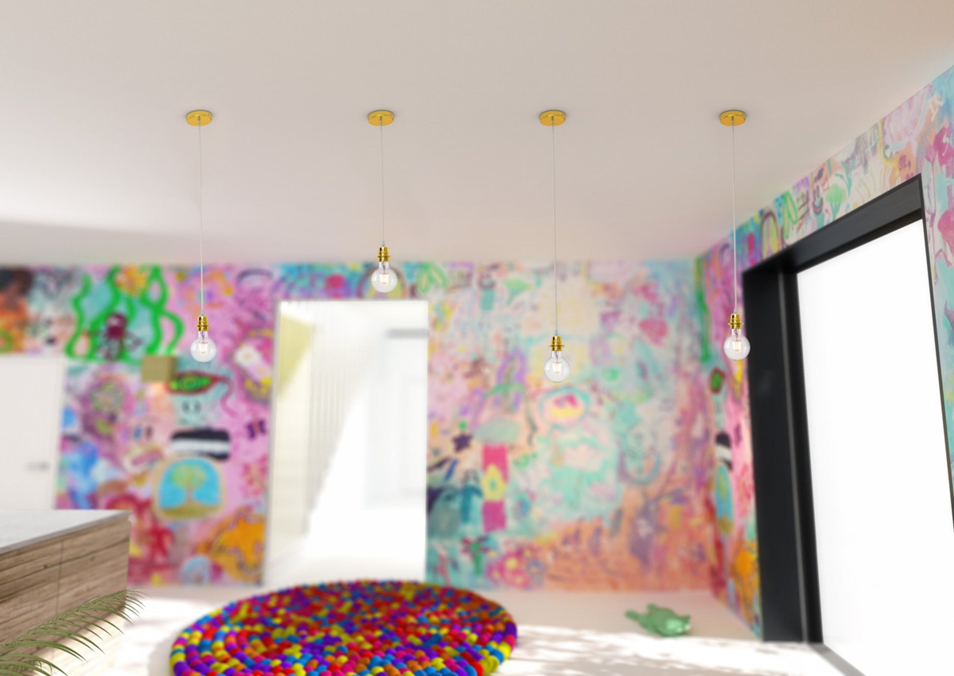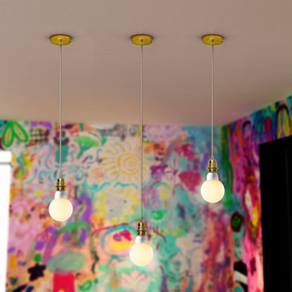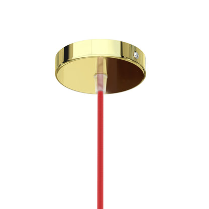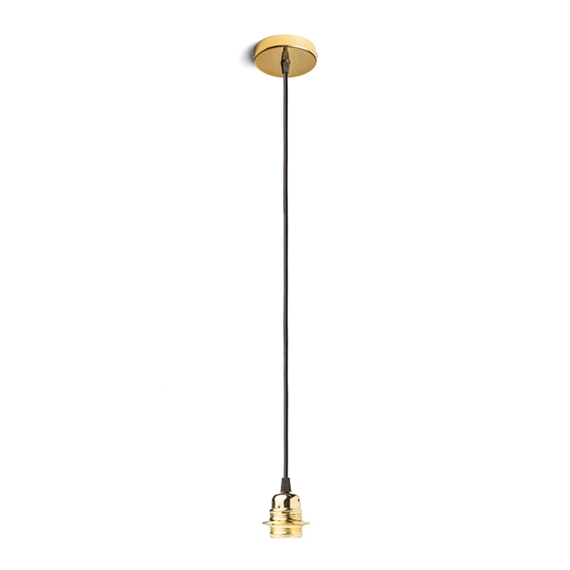 Pendelsats med rund takkåpa i guld, textilsladd och en E27 sockel i metall. Lämplig med eller utan lättare skärm. Lämpliga skärmar: DOUBLE 40/30, DOUBLE 55/30, ASPRO 40/30, ASPRO 55/30, RON 40/25, RON 55/30, RON 60/19, TEMPO 30/19, TEMPO 50/19.