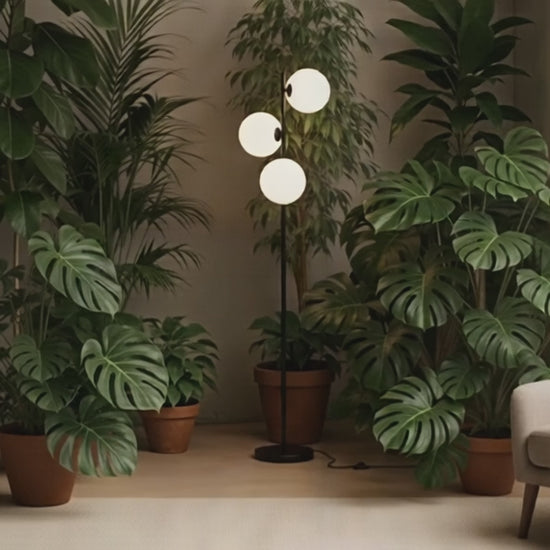 Golvlampa med tre glasskärmar av opalfärgat glas på en svartlackerad bas. Lämplig för G9 LED-ljuskällor.