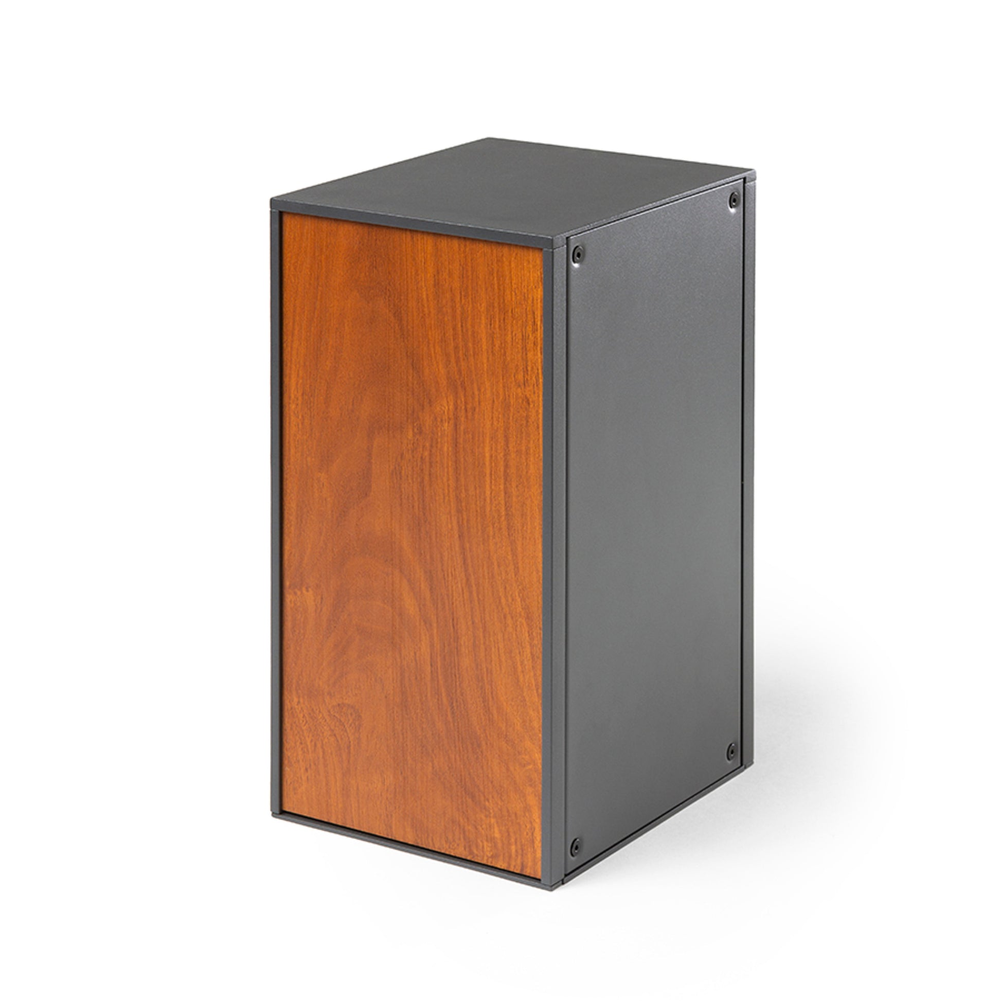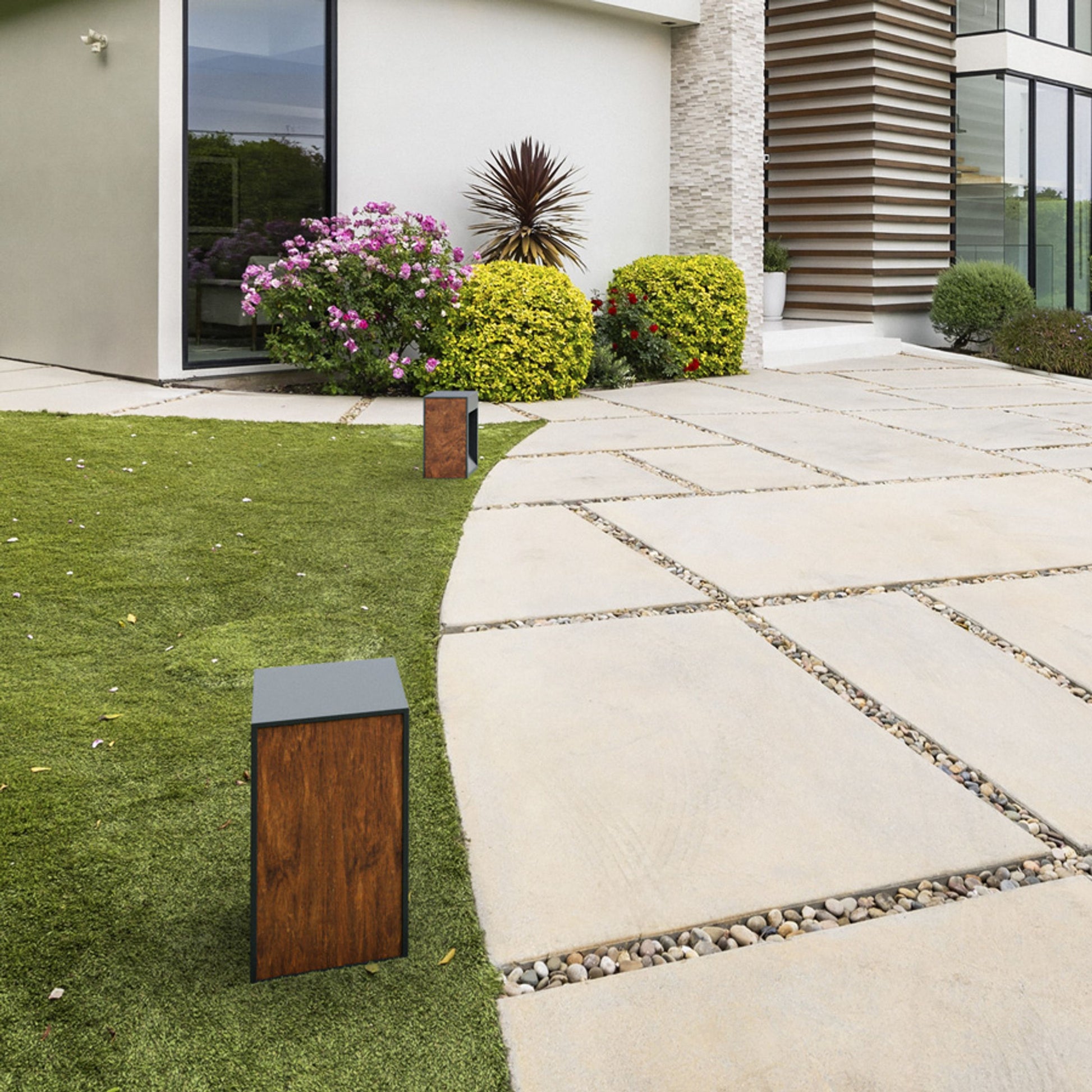 Massiv pollare med trädekor på sidorna för utomhusbruk. Denna pollare är designad för linjära LED-källor med en R7s 78 mm bas och rymmer diametrar upp till 20 mm.