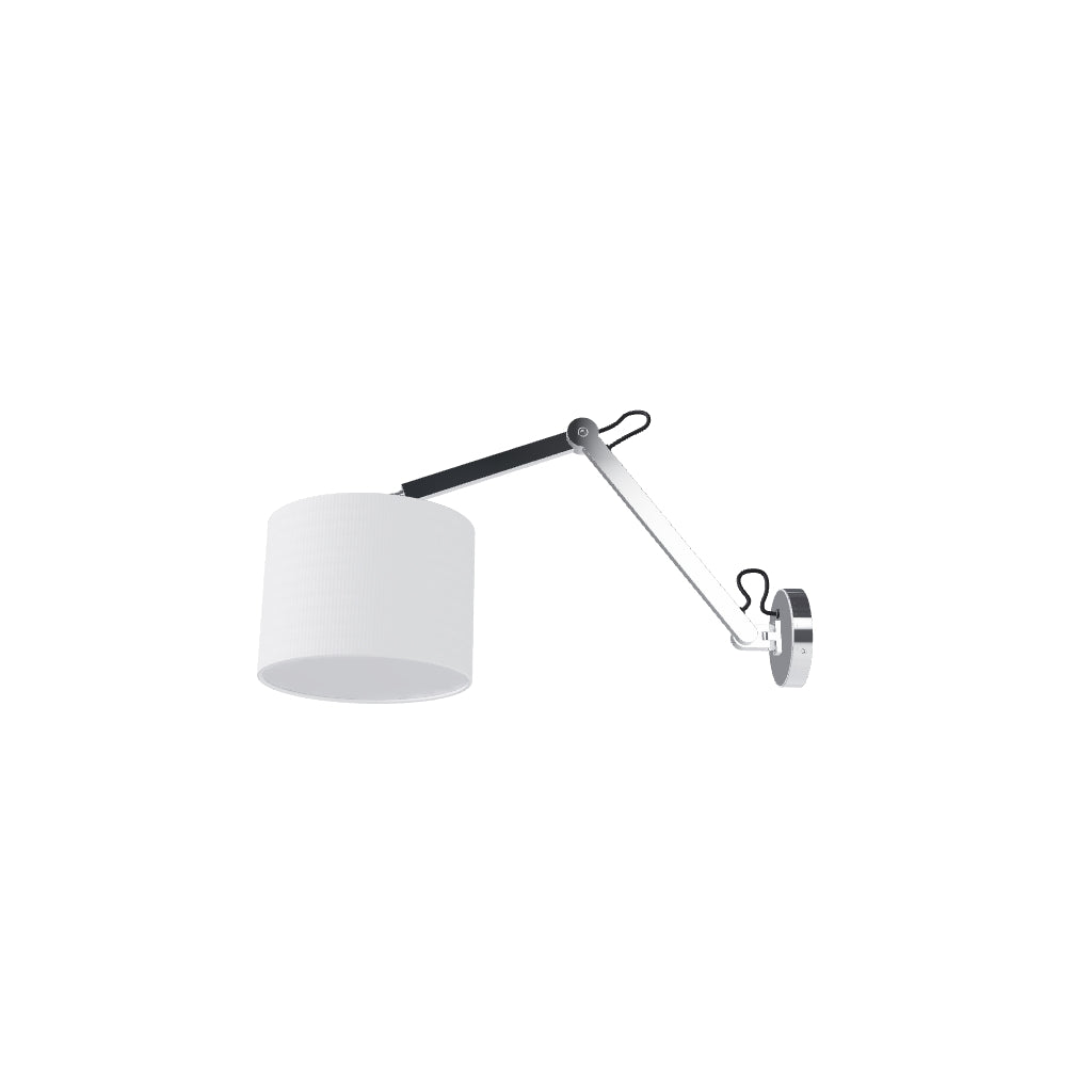 Vägglampa med tvådelad justerbar arm och textilskärm.