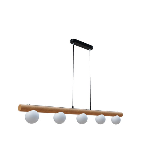 Pendellampa med fem opalfärgade glasskärmar monterade på en träbas. Takbasen är av lackad metall.