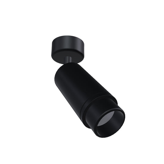 Cylindrisk spotlight med GU10-sockel för LED-ljuskällor som har möjlighet att ändra ljusvinkeln på ljuskällan mellan 10-50° via den s.k. zoom-funktionen. För att undvika oönskade skuggor bör lampan kompletteras med ljuskällor som har spridningsvinkel på 120°.