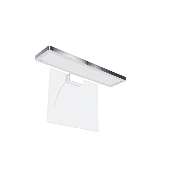 Rektangulär badrumslampa av kromfärgad metall med inbyggd LED och dubbelriktat ljus. Lämplig för installation på skåp och hyllor.